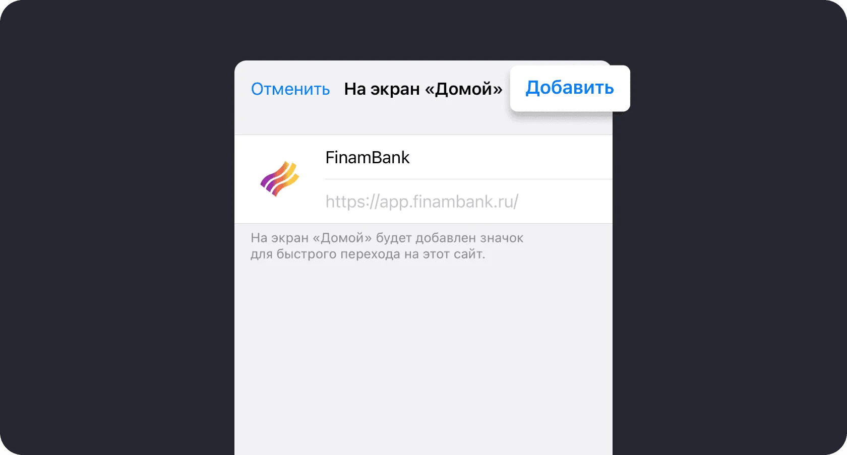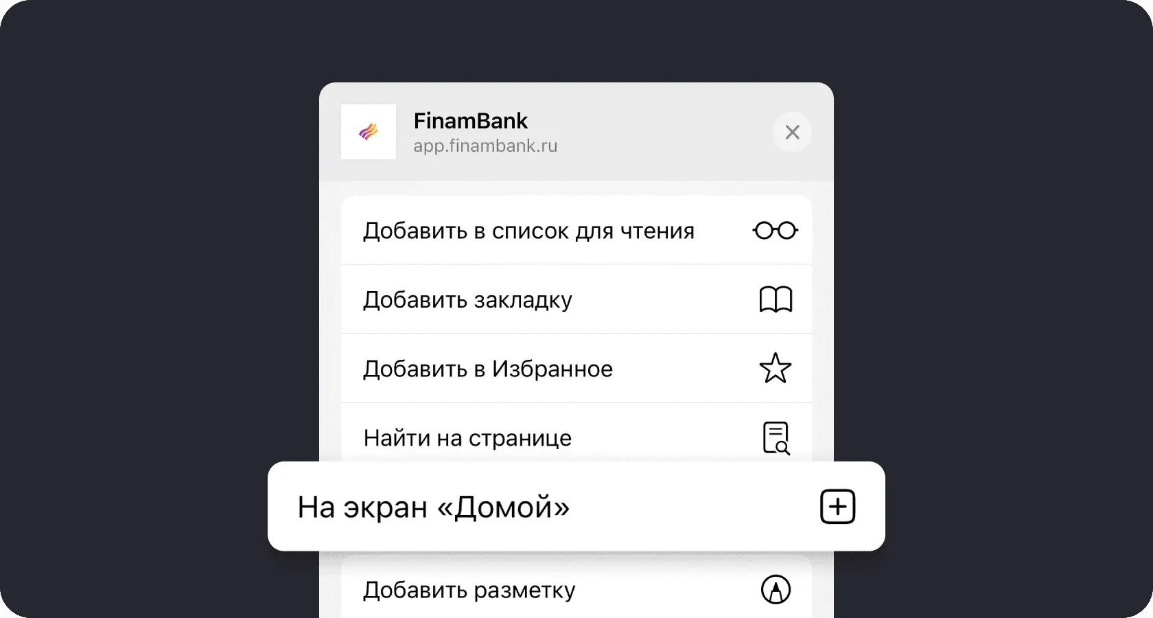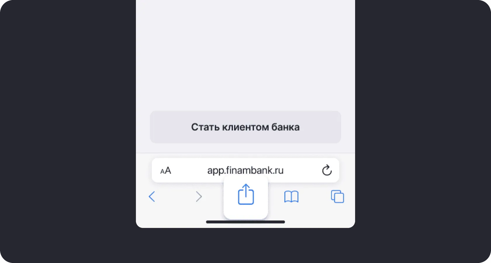 Перейдите в app.finambank.ru через браузер Safari и нажмите на значок Поделиться внизу экрана